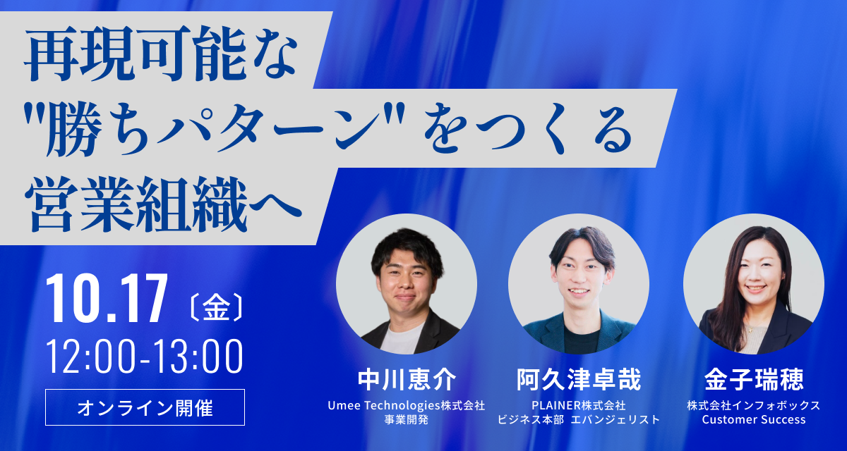 ご入力いただいた個人情報(会社名、部署、役職、氏名、メールアドレス、電話番号)は、当社(株式会社インフォボックス)及び共催の(PLAINER株式会社)及び(Umee Technologies株式会社)の製品・サービス・イベント等のご案内およびお客様によるご導入の支援に係る業務を行うために利用させて頂く場合があります。取得した個人情報は取得した目的以外で使うことはありません。詳細は各社の「個人情報保護方針」をご確認ください。